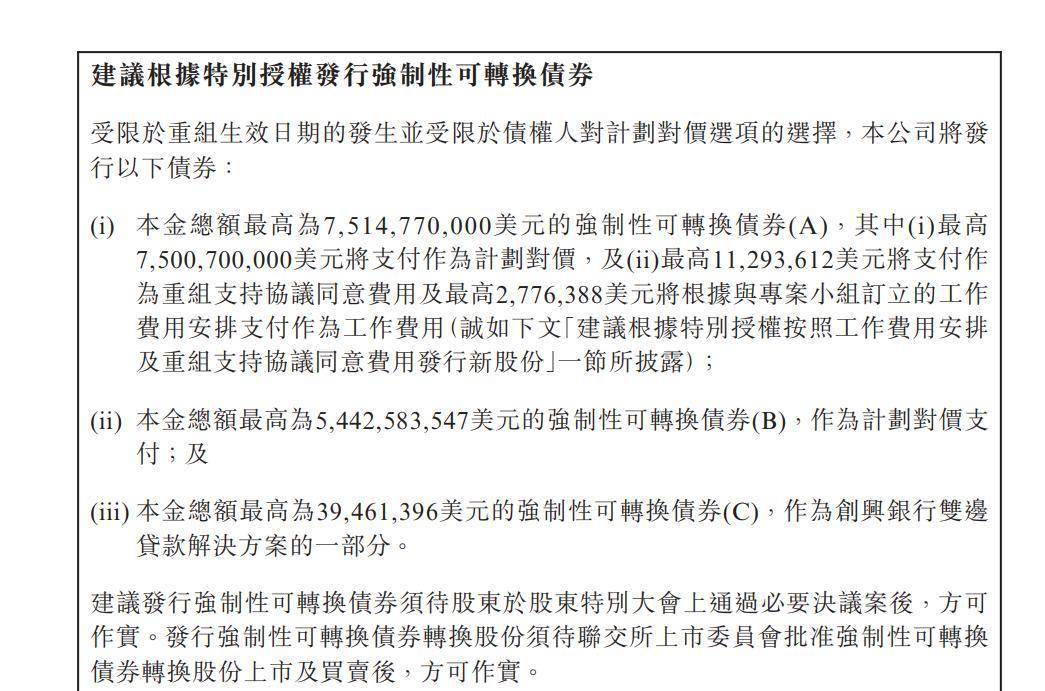 公司表示,受限于重组生效日期的发生并受限于债权人对计划对价选项的选择,公司将发行以下债券:本金总额最高约为75.15亿美元的强制性可转换债券(A),其中最高约75亿美元将支付作为计划对价,最高约1129.36万美元将支付作为重组支持协议同意费用及最高约277.64万美元将根据与项目小组订立的工作费用安排支付作为工作费用;