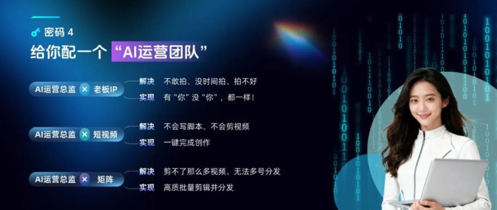四、配置“AI员工”,解决“不敢拍、没时间拍、拍不好”的痛点。搭建“AI运营团队”覆盖全链路需求:AI运营总监对接老板IP,确保内容更新不中断;AI创意总监产出行业适配内容;AI剪辑师实现批量剪辑与多账号分发。