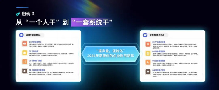 三、“摇人、组队、打群架”,搭建企业账号矩阵抓住流量红利。单一账号覆盖有限,矩阵运营能激活内部员工、渠道商等隐形资产,形成协同效应。做矩阵的关键是快速行动,总部定调、员工渗透、渠道触达,组队作战覆盖更广泛客户。